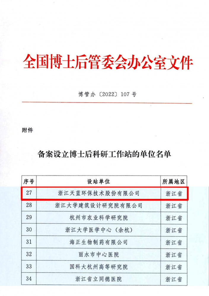 浙江天藍(lán)環(huán)保技術(shù)股份有限公司獲批國家級(jí)博士后工作站,標(biāo)志著天藍(lán)環(huán)保在人才隊(duì)伍、技術(shù)創(chuàng)新和科研平臺(tái)建設(shè)上的重大突破。